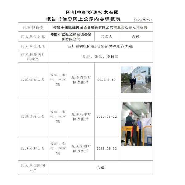 德陽中銘數控機械設備股份有限公司職業病危害定期檢測