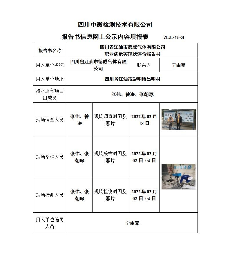 四川省江油市德威氣體有限公司職業病危害現狀評價