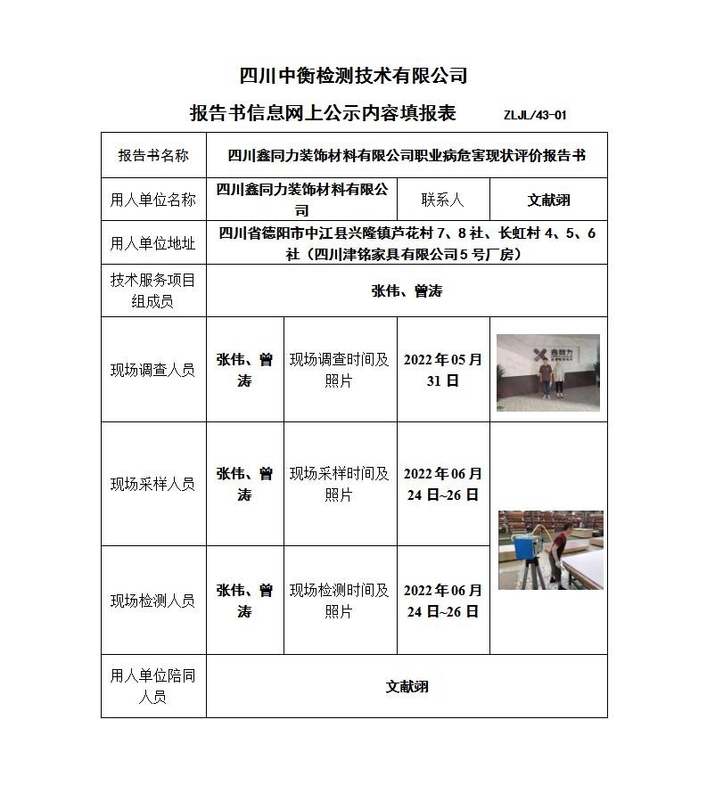 四川鑫同力裝飾材料有限公司職業病危害現狀評價
