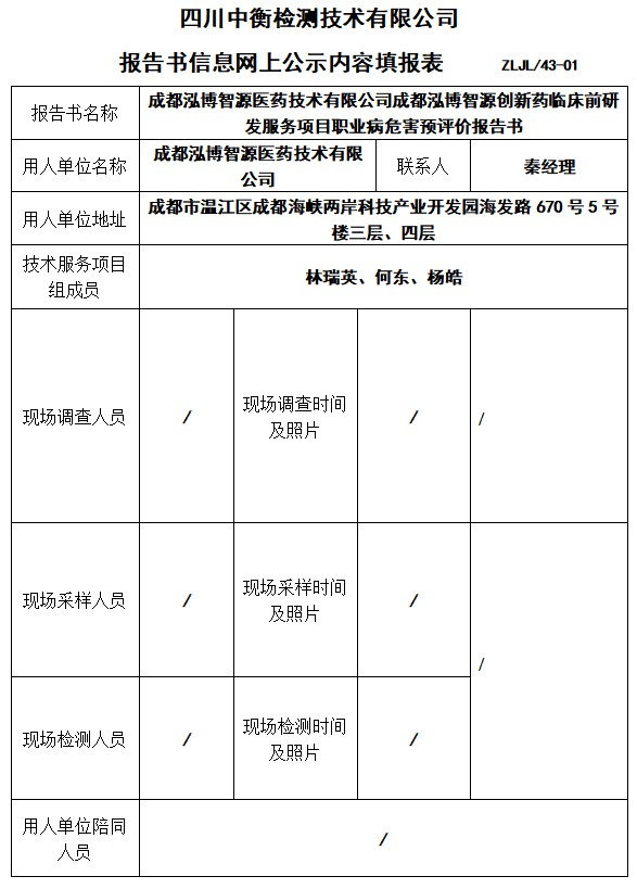 成都泓博智源醫藥技術有限公司成都泓博智源創新藥臨床前研發服務項目預評價