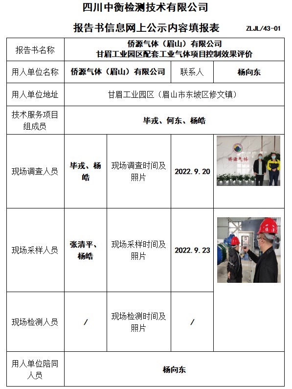 僑源氣體(眉山)有限公司 甘眉工業(yè)園區(qū)配套工業(yè)氣體項目控制效果評價