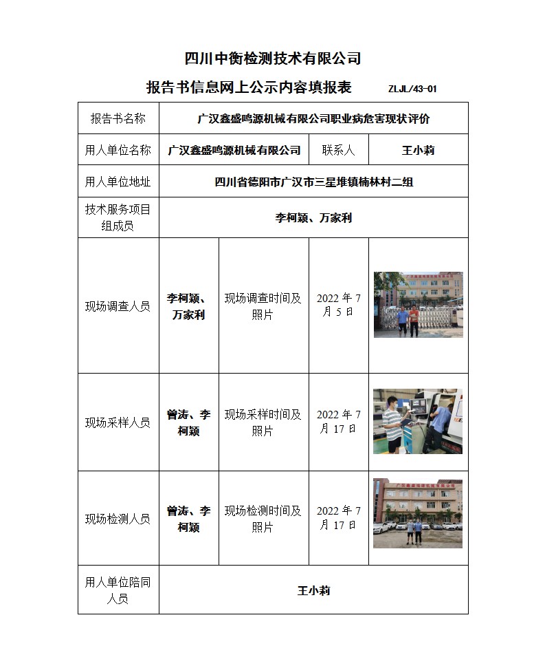 廣漢鑫盛鳴源機械有限公司 職業病危害現狀評價報告書