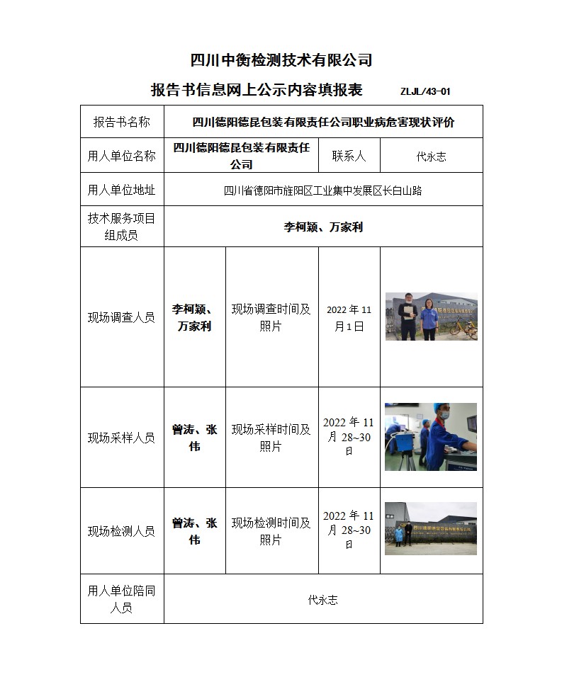 四川德陽德昆包裝有限責(zé)任公司 職業(yè)病危害現(xiàn)狀評價報告書