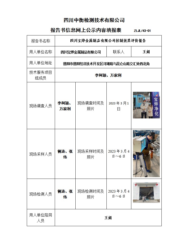 四川寶燁金屬制品有限公司 智能納米高新建筑材料生產(chǎn)項(xiàng)目 職業(yè)病危害控制效果評(píng)價(jià)報(bào)告書