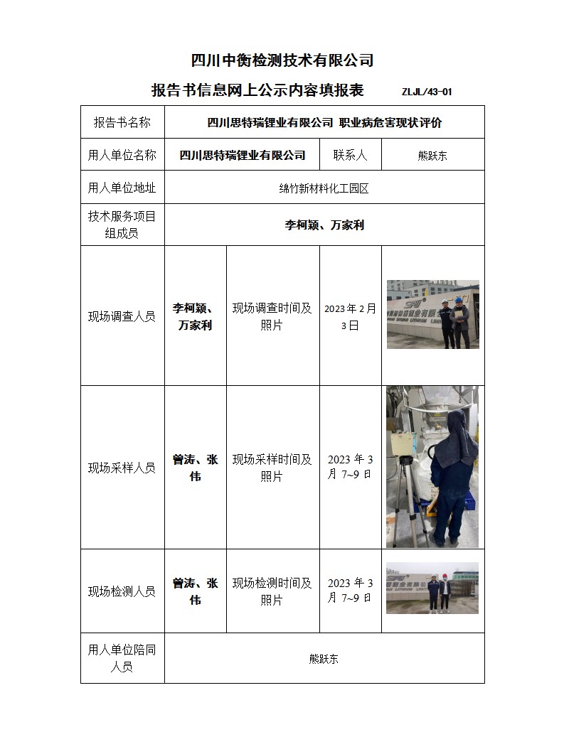 四川思特瑞鋰業(yè)有限公司 職業(yè)病危害現(xiàn)狀評價報告書