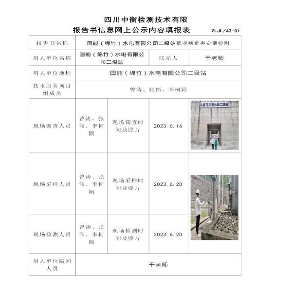 國(guó)能(綿竹)水電有限公司二級(jí)站職業(yè)病危害定期檢測(cè)