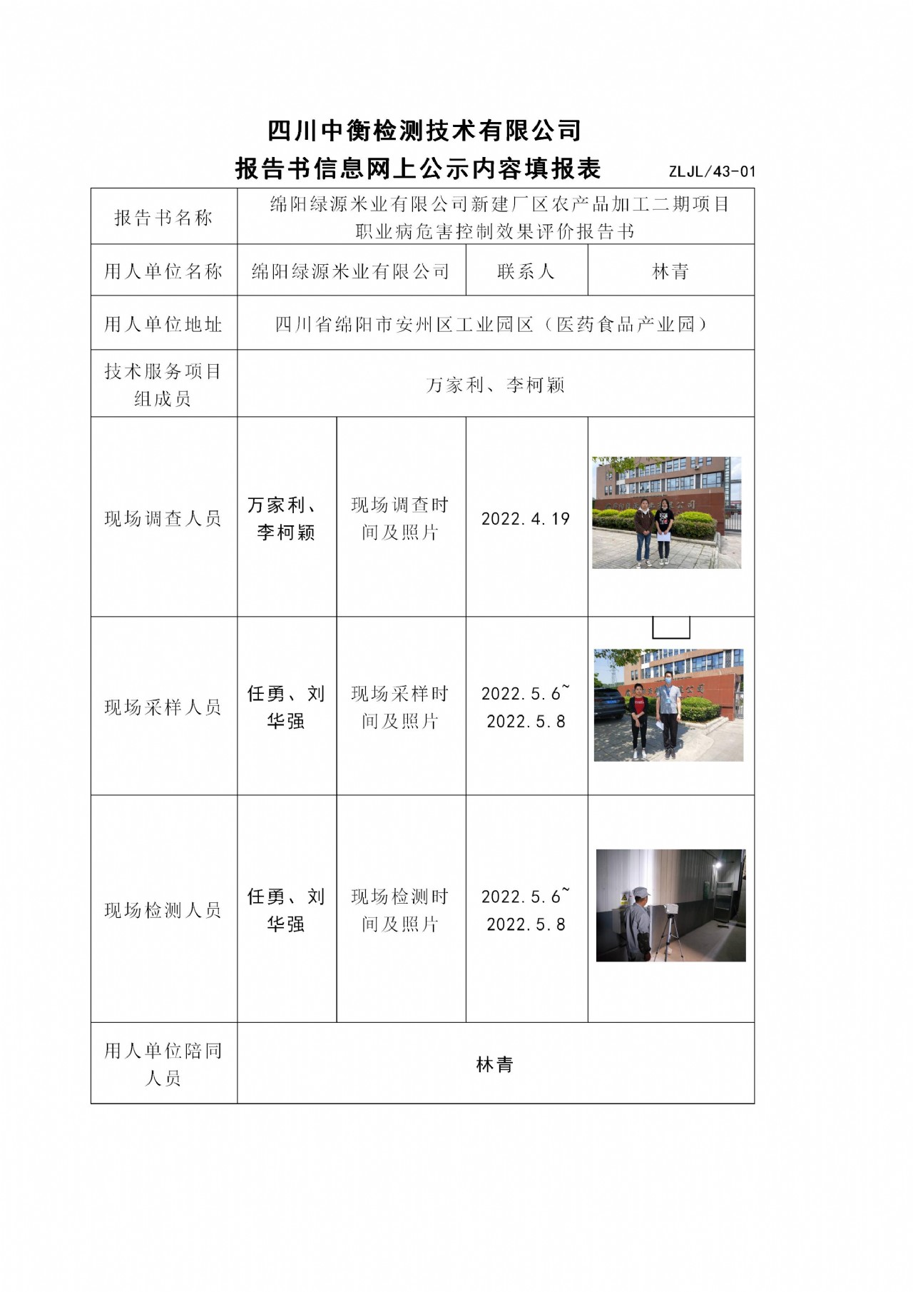 綿陽綠源米業有限公司新建廠區農產品加工二期項目 職業病危害控制效果評價