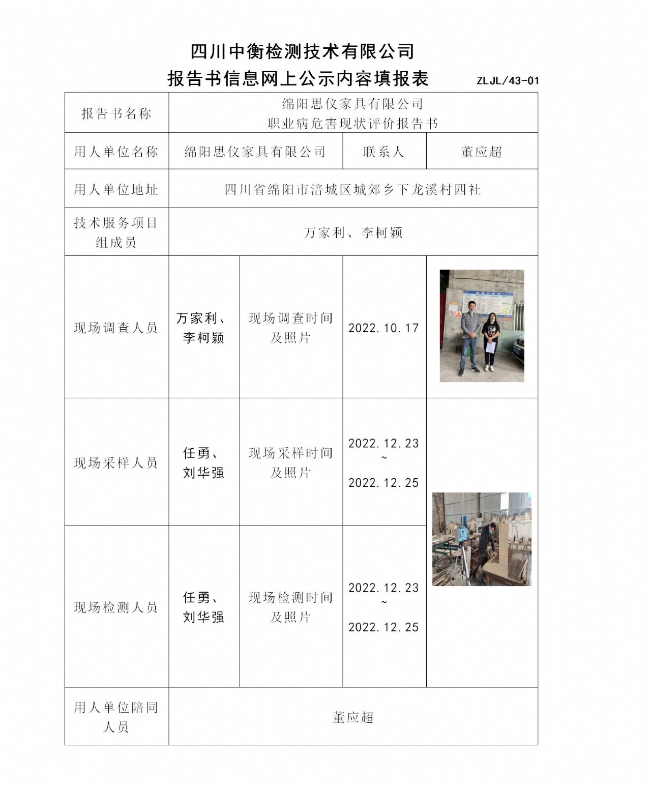 綿陽思儀家具有限公司 職業病危害現狀評價