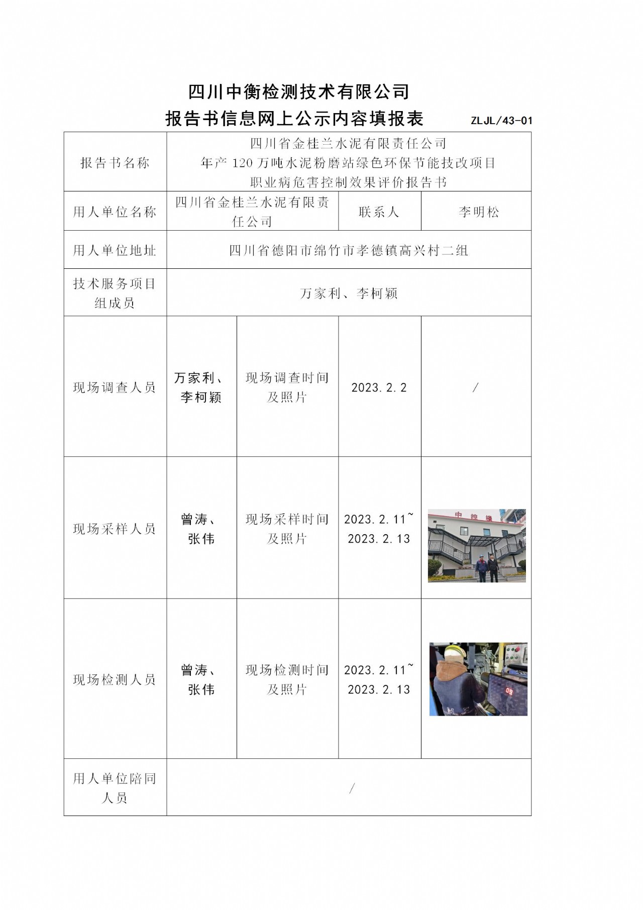 四川省金桂蘭水泥有限責任公司 年產120萬噸水泥粉磨站綠色環保節能技改項目 職業病危害控制效果評價