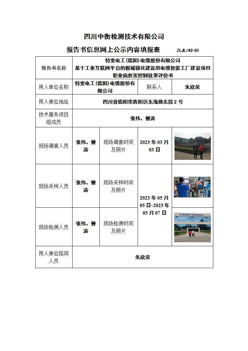 特變電工(德陽)電纜股份有限公司“基于工業互聯網平臺的新城鎮化建設用電纜智能工廠建設項目”職業病危害控制效果評價