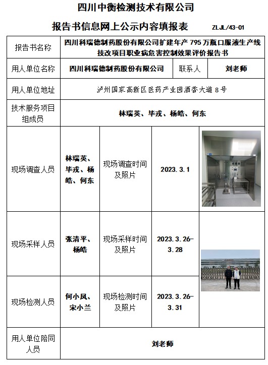 四川科瑞德制藥股份有限公司擴(kuò)建年產(chǎn)795萬瓶口服液生產(chǎn)線技改項(xiàng)目職業(yè)病危害控制效果評價報(bào)告書