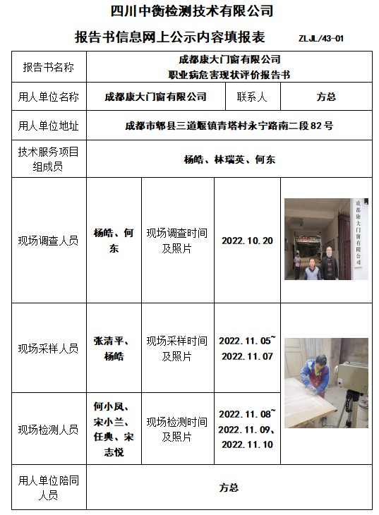 成都康大門窗有限公司 職業病危害現狀評價報告書