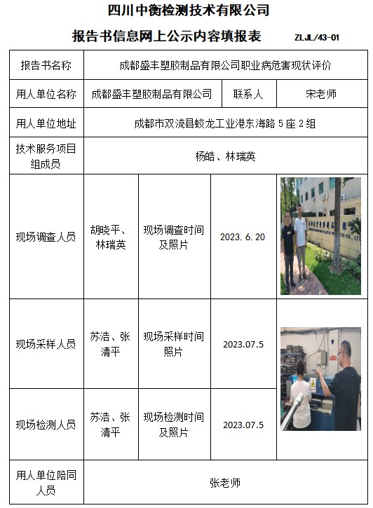 成都盛豐塑膠制品有限公司職業病危害現狀評價