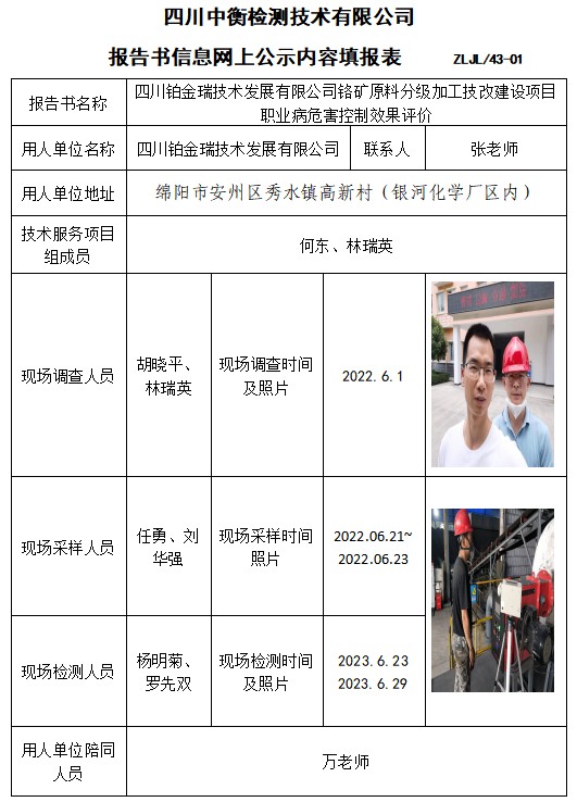 四川鉑金瑞技術發展有限公司鉻礦原料分級加工技改建設項目 職業病危害控制效果評價