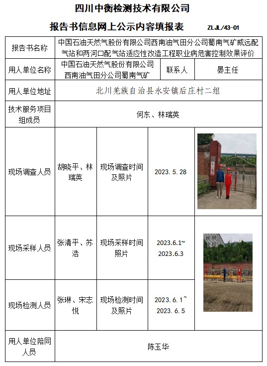 中國石油天然氣股份有限公司西南油氣田分公司蜀南氣礦威遠配氣站和兩河口配氣站適應性改造工程職業病危害控制效果評價