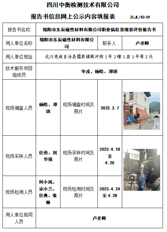 綿陽市東辰磁性材料有限公司職業病危害現狀評價報告書