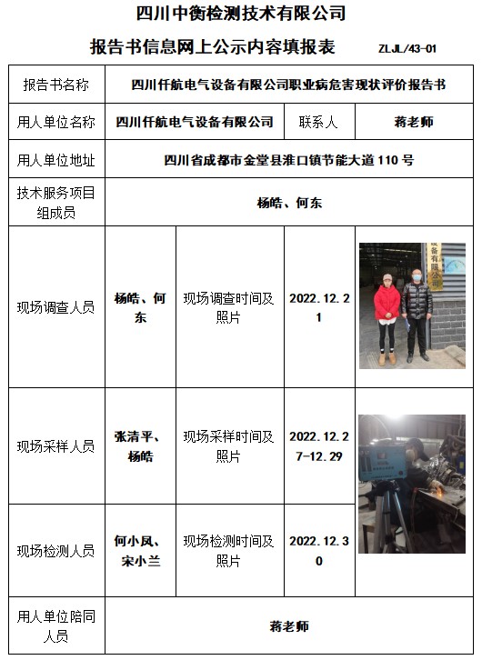 四川仟航電氣設備有限公司職業病危害現狀評價報告書