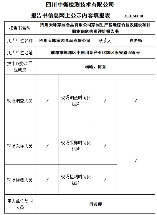 四川天味家園食品有限公司家園生產基地綜合技改建設項目職業病危害預評價報告書