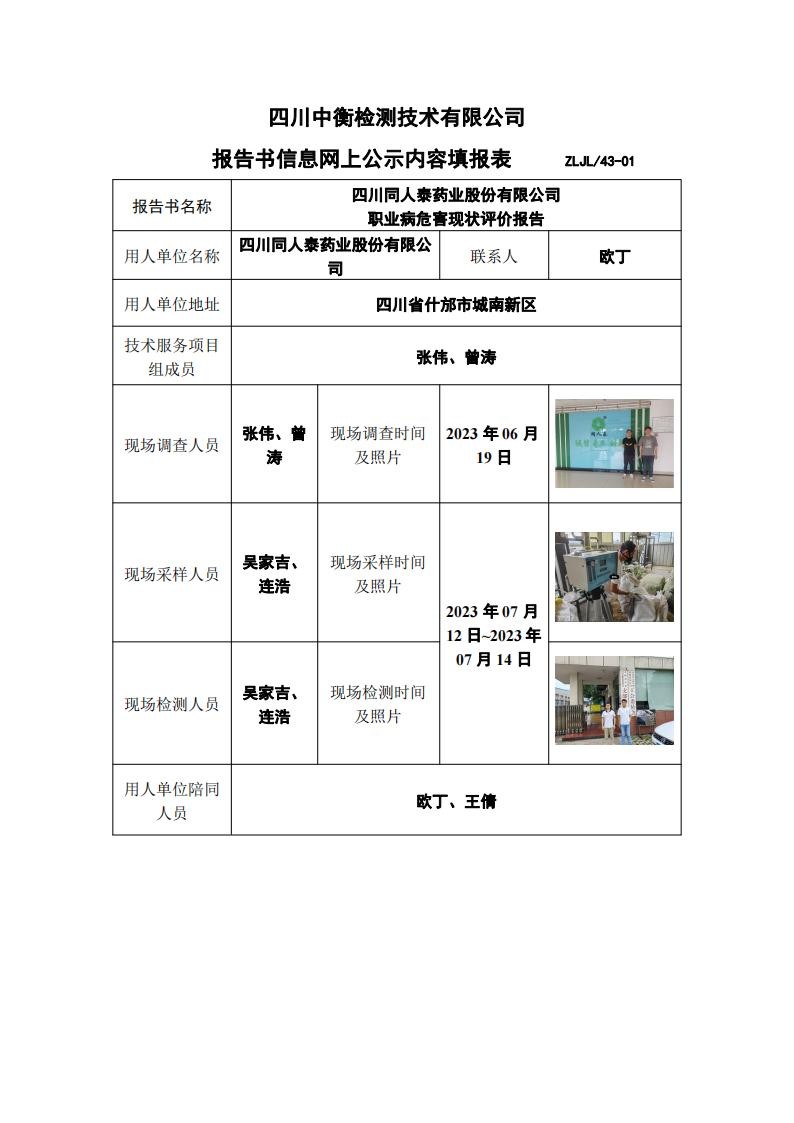 四川同人泰藥業股份有限公司職業病危害現狀評價