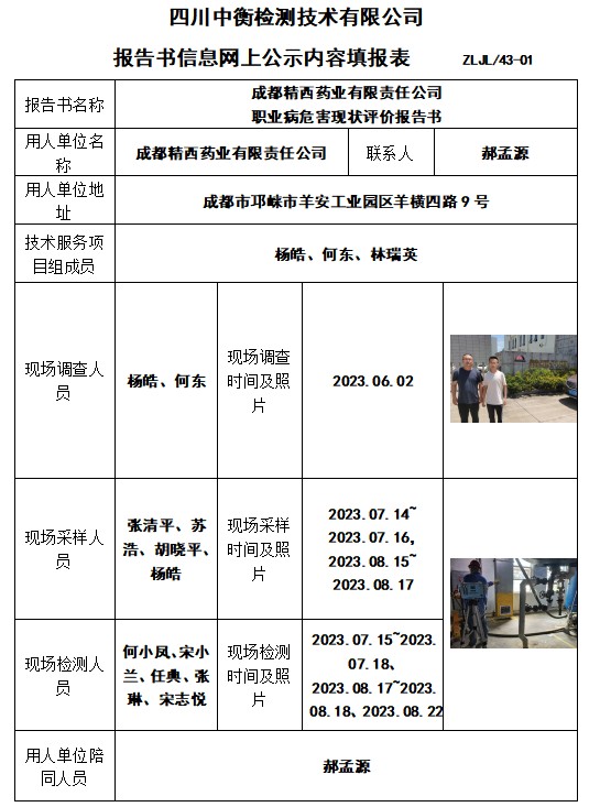 成都精西藥業有限責任公司 職業病危害現狀評價