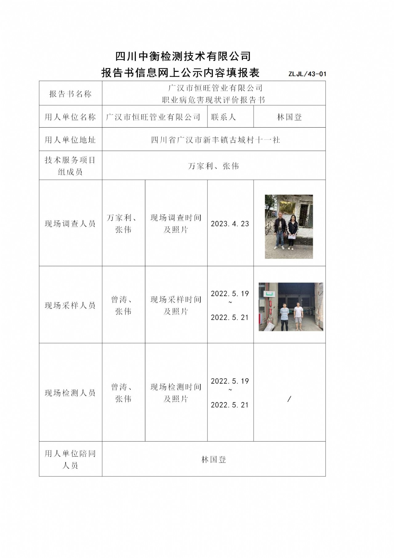 廣漢市恒旺管業有限公司 職業病危害現狀評價