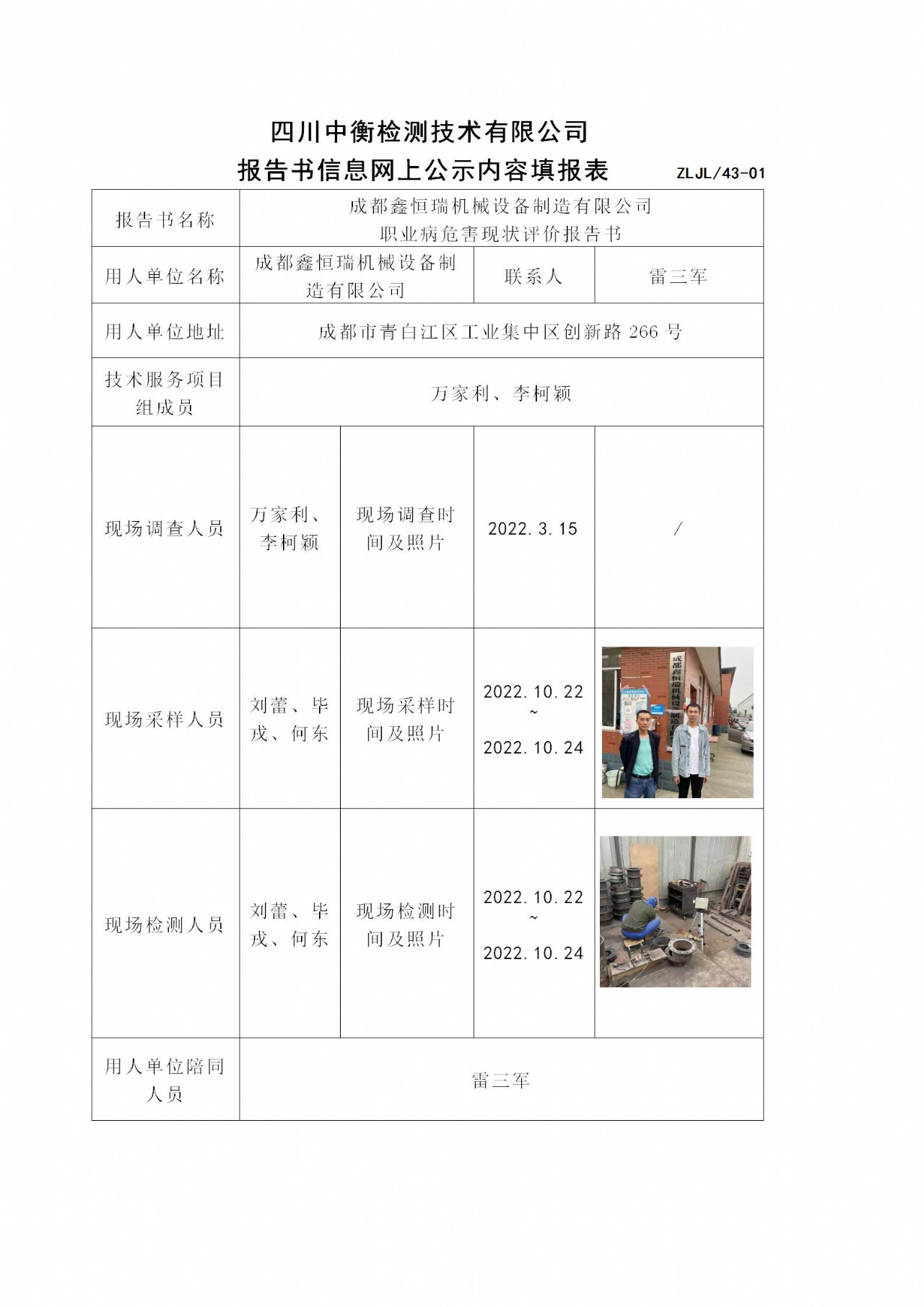 成都鑫恒瑞機械設備制造有限公司 職業病危害現狀評價