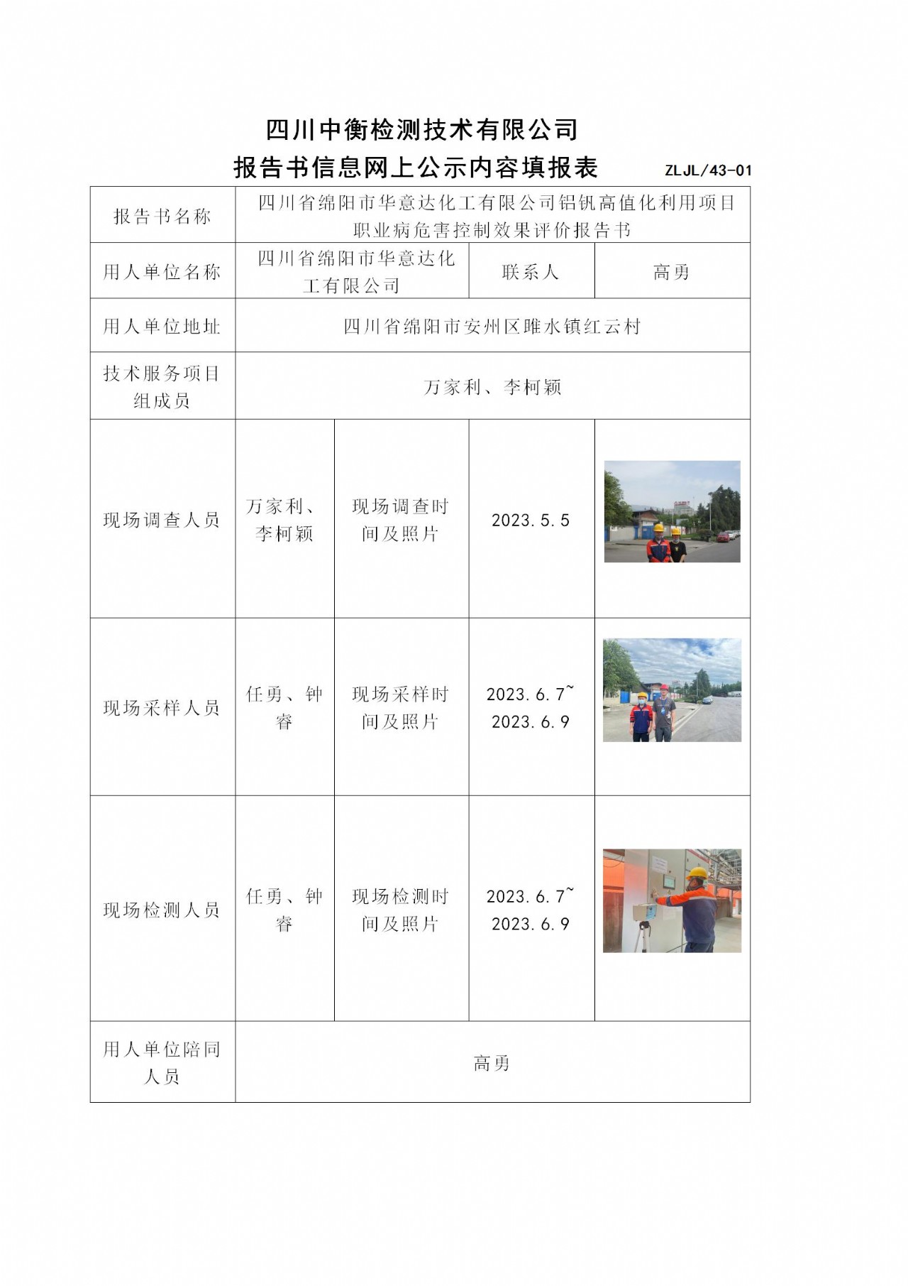 四川省綿陽市華意達化工有限公司鋁釩高值化利用項目 職業病危害控制效果評價