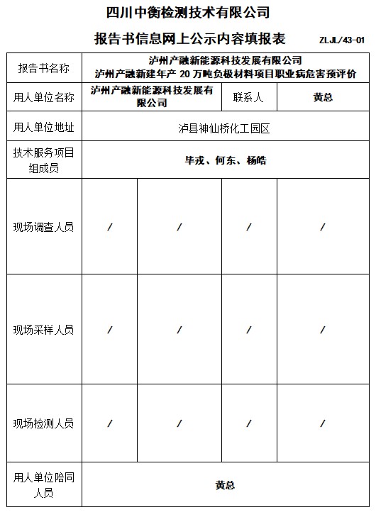 瀘州產融新能源科技發展有限公司 瀘州產融新建年產20萬噸負極材料項目職業病危害預評價