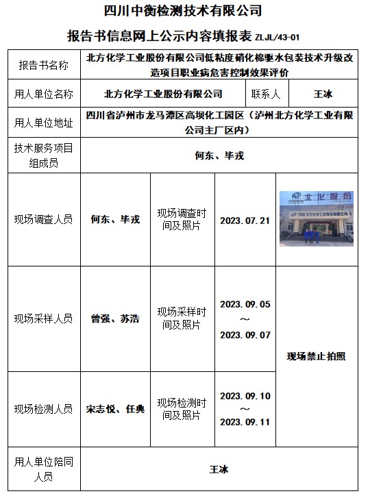 北方化學工業股份有限公司低粘度硝化棉驅水包裝技術升級改造項目職業病危害控制效果評價