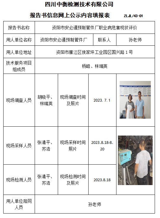 資陽市安必通預(yù)制管件廠職業(yè)病危害現(xiàn)狀評價
