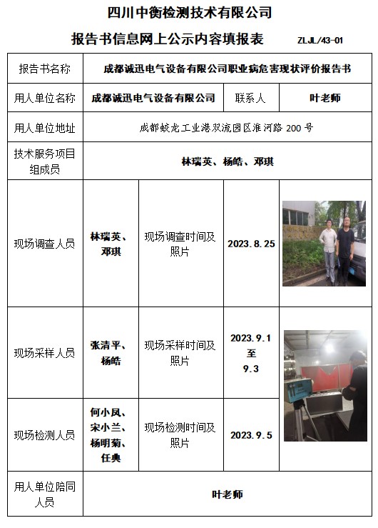 成都誠迅電氣設備有限公司職業病危害現狀評價報告書