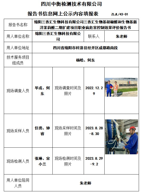 綿陽(yáng)三香匯生物科技有限公司三香匯生物基胡椒醛和生物基新洋茉莉醛二期擴(kuò)建項(xiàng)目職業(yè)病危害控制效果評(píng)價(jià)報(bào)告書