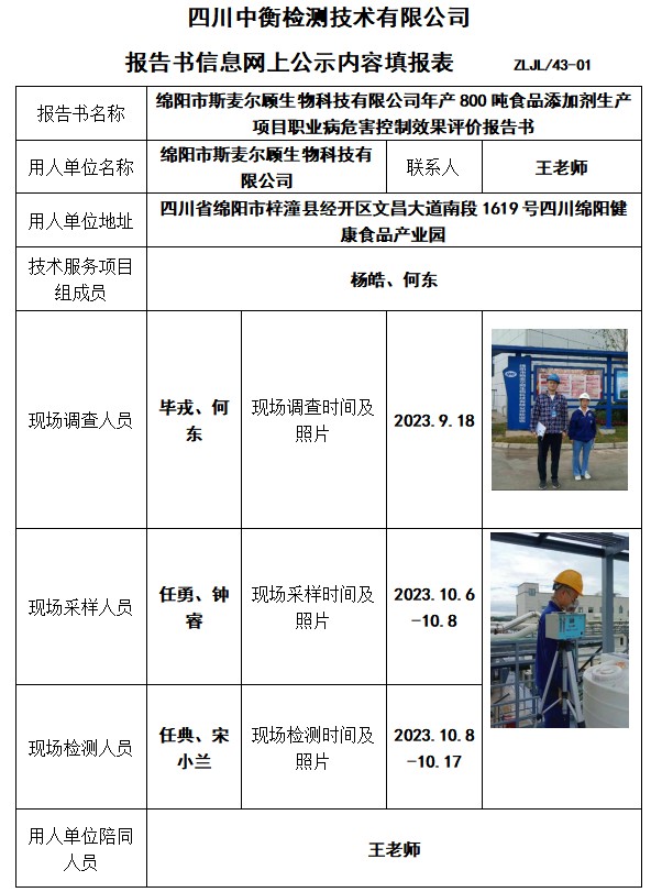 綿陽市斯麥爾顧生物科技有限公司年產800噸食品添加劑生產項目職業(yè)病危害控制效果評價報告書