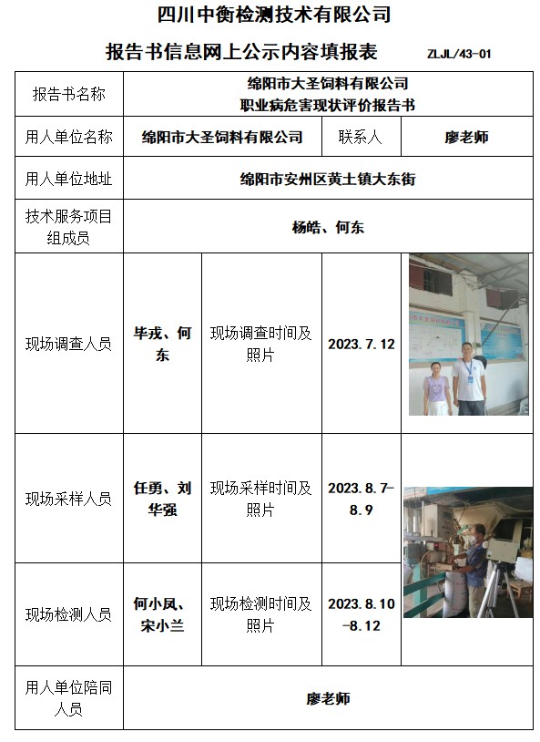 綿陽市大圣飼料有限公司 職業(yè)病危害現(xiàn)狀評價報告書