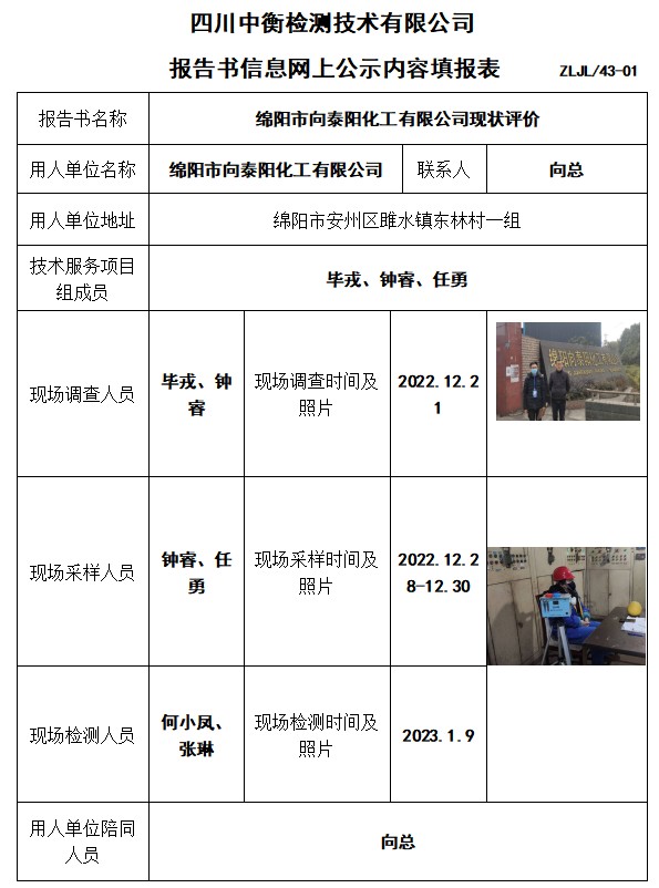 綿陽市向泰陽化工有限公司現狀評價