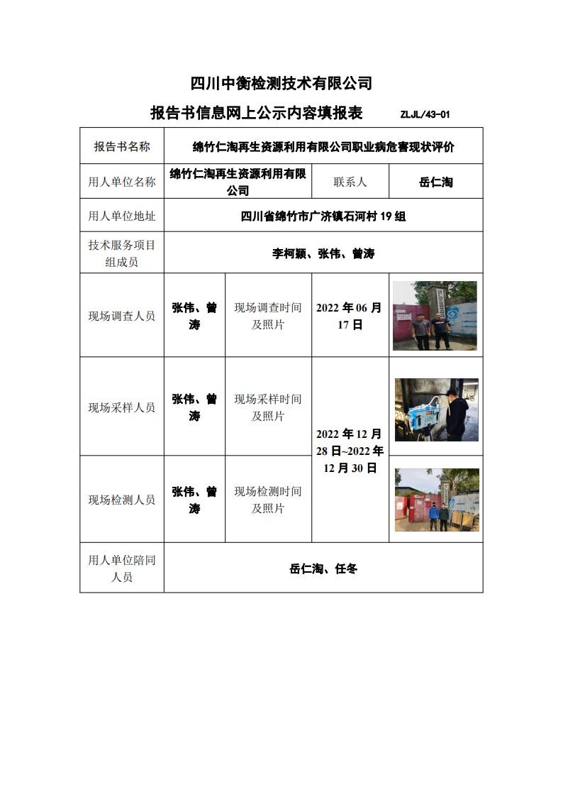 綿竹仁淘再生資源利用有限公司職業病危害現狀評價