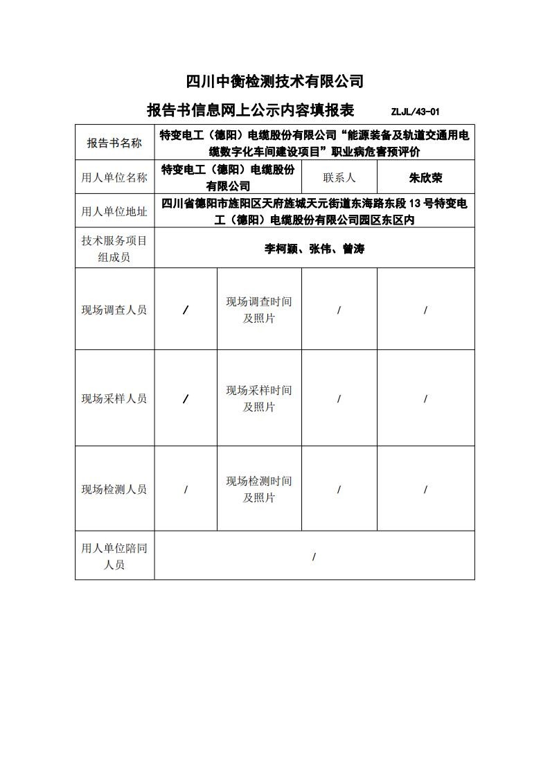 特變電工(德陽)電纜股份有限公司“能源裝備及軌道交通用電纜數字化車間建設項目”職業病危害預評價
