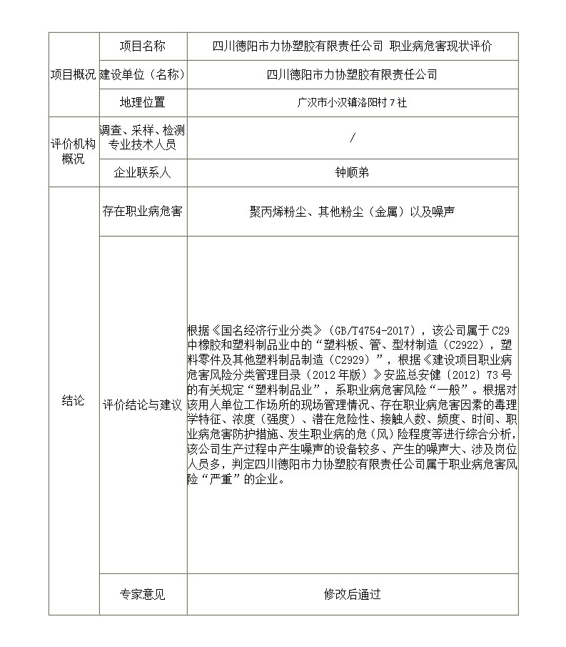 四川德陽市力協塑膠有限責任公司 職業病危害現狀評價報告書