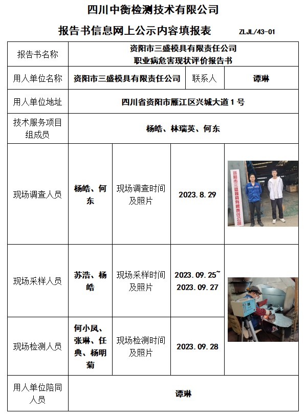 資陽市三盛模具有限責(zé)任公司 職業(yè)病危害現(xiàn)狀評價報告書