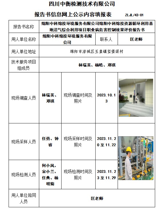 綿陽中科綿投環境服務有限公司綿陽中科綿投資源循環利用基地沼氣綜合利用項目職業病危害控制效果評價報告書