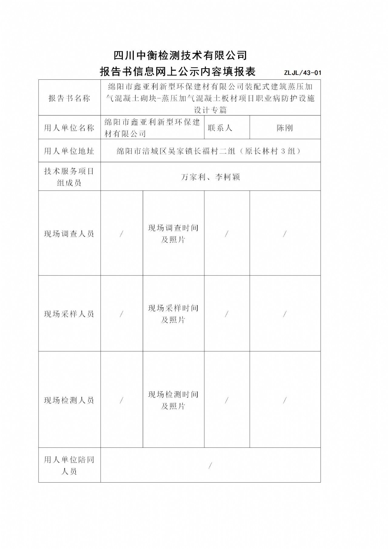 綿陽市鑫亞利新型環保建材有限公司裝配式建筑蒸壓加氣混凝土砌塊-蒸壓加氣混凝土板材項目職業病防護設施設計專篇