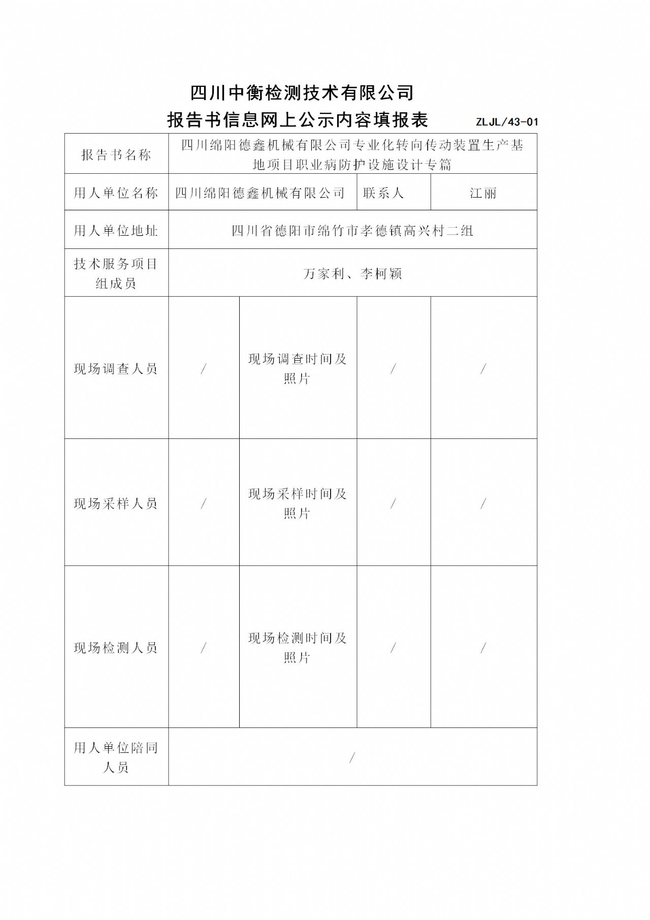 四川綿陽德鑫機械有限公司專業化轉向傳動裝置生產基地項目職業病防護設施設計專篇