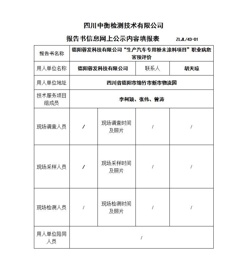 德陽蓉發科技有限公司“生產汽車專用粉末涂料項目”職業病危害預評價