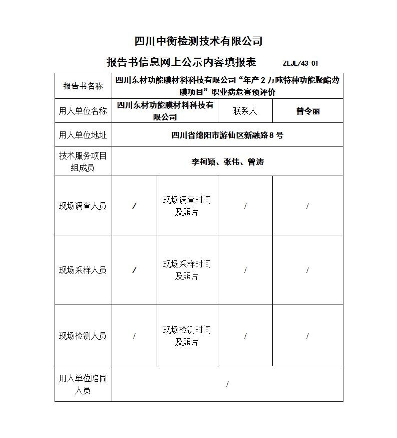 四川東材功能膜材料科技有限公司“年產2萬噸特種功能聚酯薄膜項目”職業病危害預評價