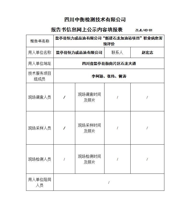鹽亭縣恒力成品油有限公司“新建石龍加油站項目”職業病危害預評價