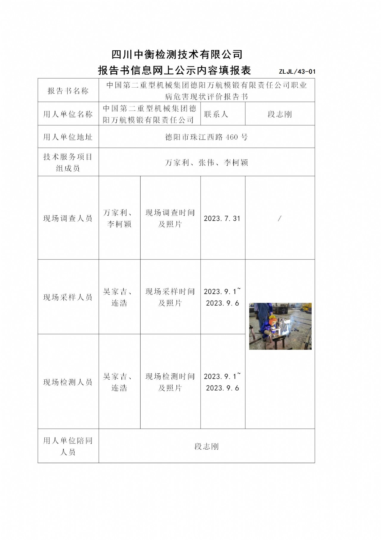 中國第二重型機械集團德陽萬航模鍛有限責任公司職業病危害現狀評價報告