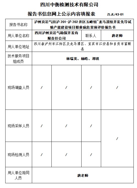 四川瀘州頁(yè)巖氣勘探開發(fā)有限責(zé)任公司 瀘州頁(yè)巖氣田瀘201-瀘202井區(qū)五峰組~龍馬溪組開發(fā)先導(dǎo)試驗(yàn)產(chǎn)能建設(shè)項(xiàng)目職業(yè)病危害預(yù)評(píng)價(jià)報(bào)告書