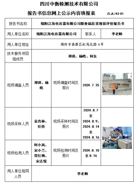 綿陽(yáng)江海電容器有限公司職業(yè)病危害現(xiàn)狀評(píng)價(jià)報(bào)告