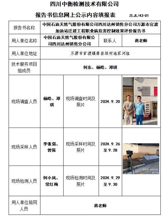中國石油天然氣股份有限公司四川達州銷售分公司萬源市官渡加油站遷建工程職業病危害控制效果評價報告書