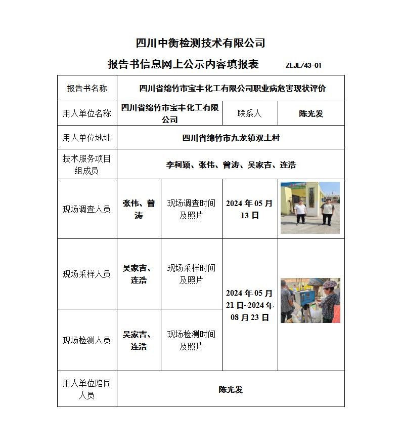 四川省綿竹市寶豐化工有限公司職業病危害現狀評價